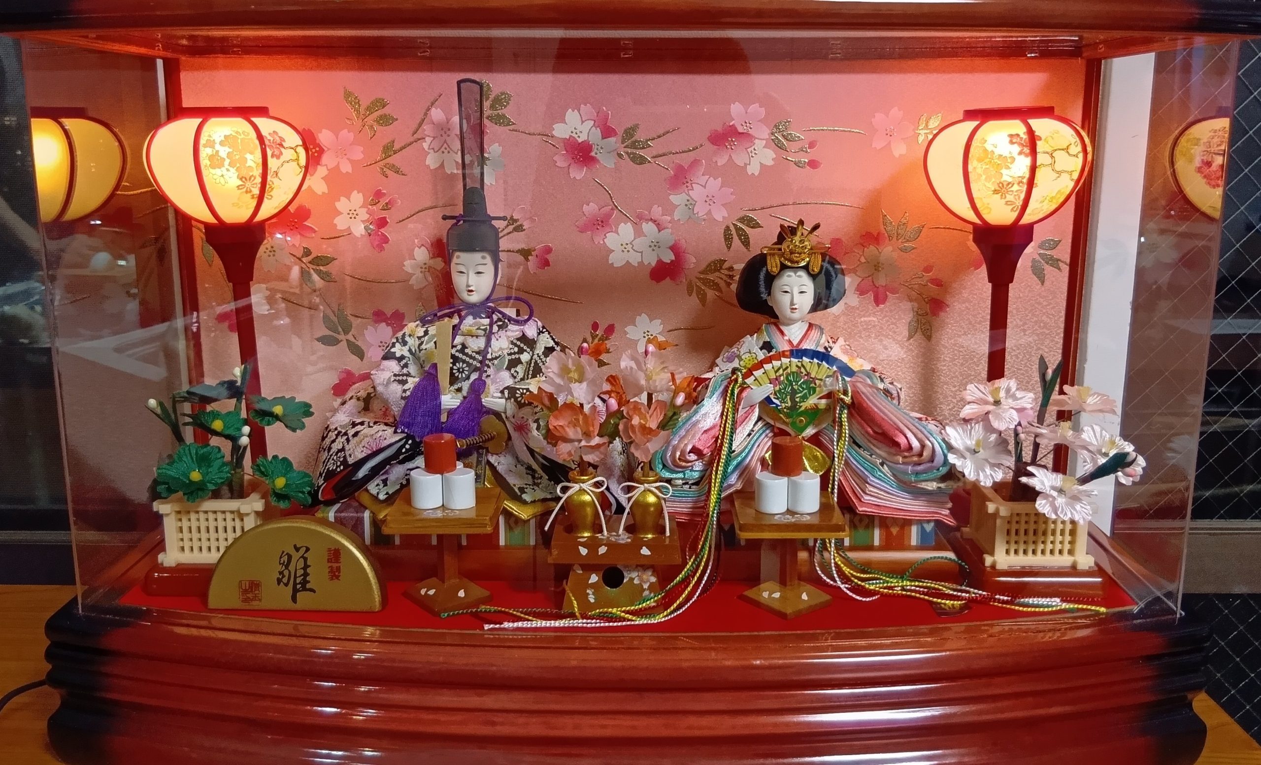 おびなは笏、めびなは檜扇を手にし、気品ある姿で飾られます。